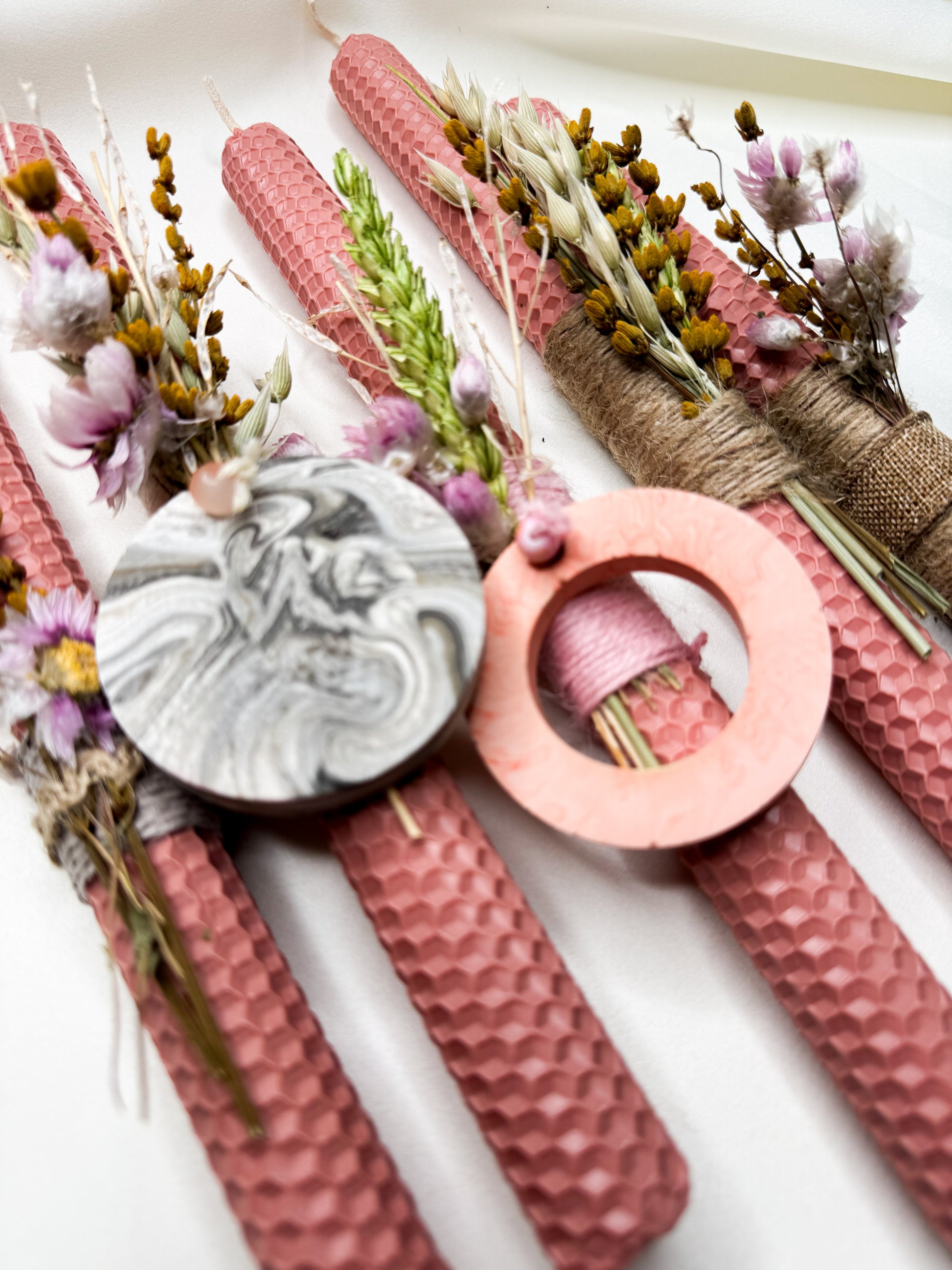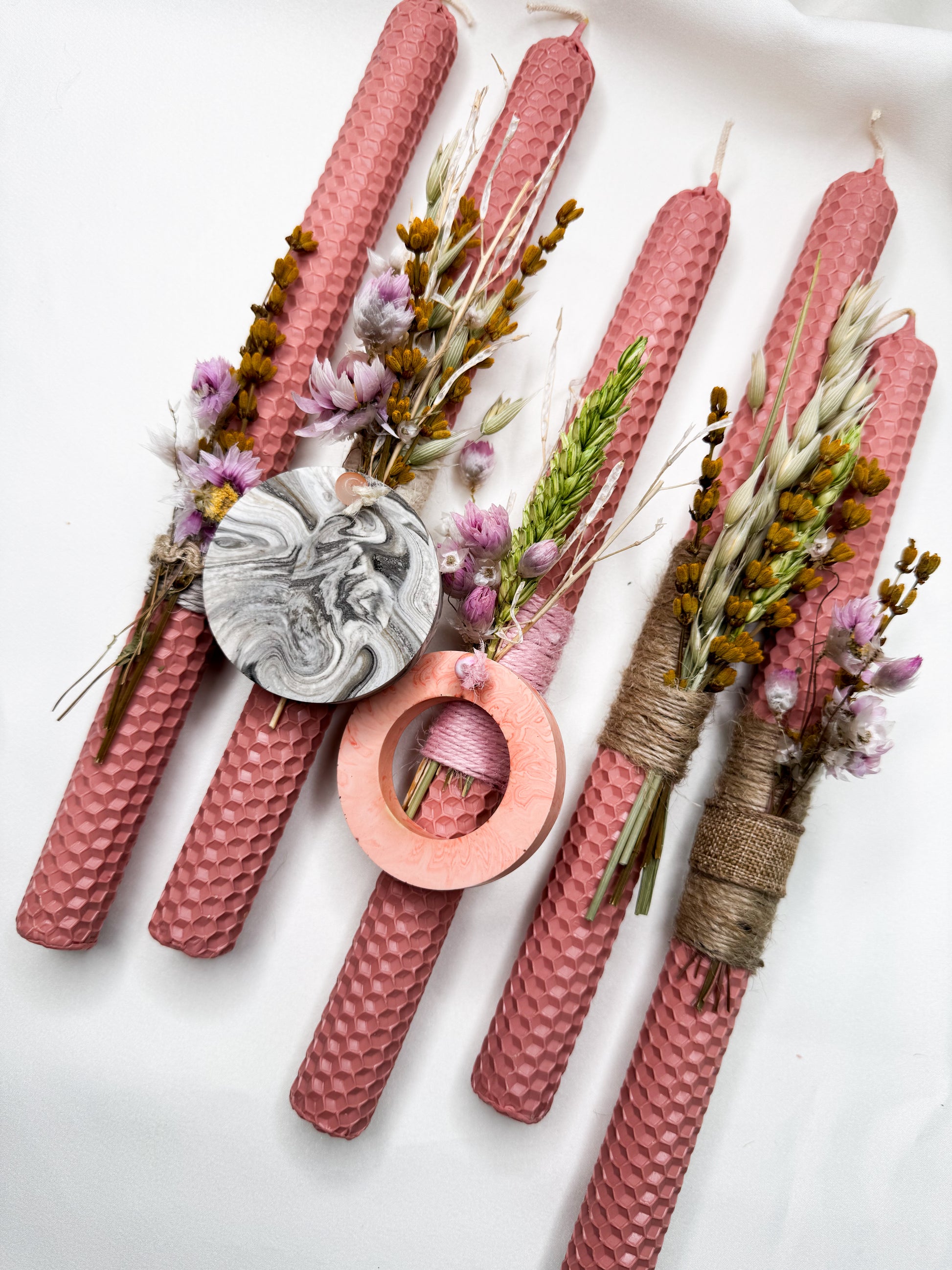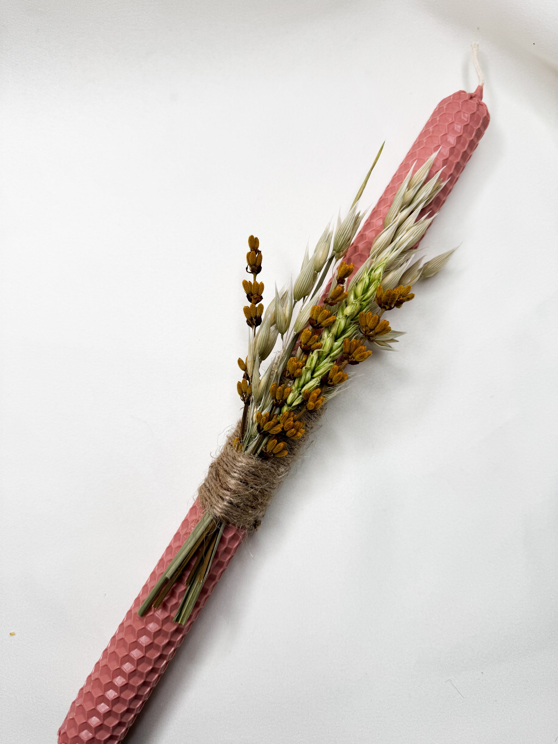 Λαμπάδα σε χρώμα Ροζ-Σομόν με διακοσμητικά αποξηραμένα λουλούδια .