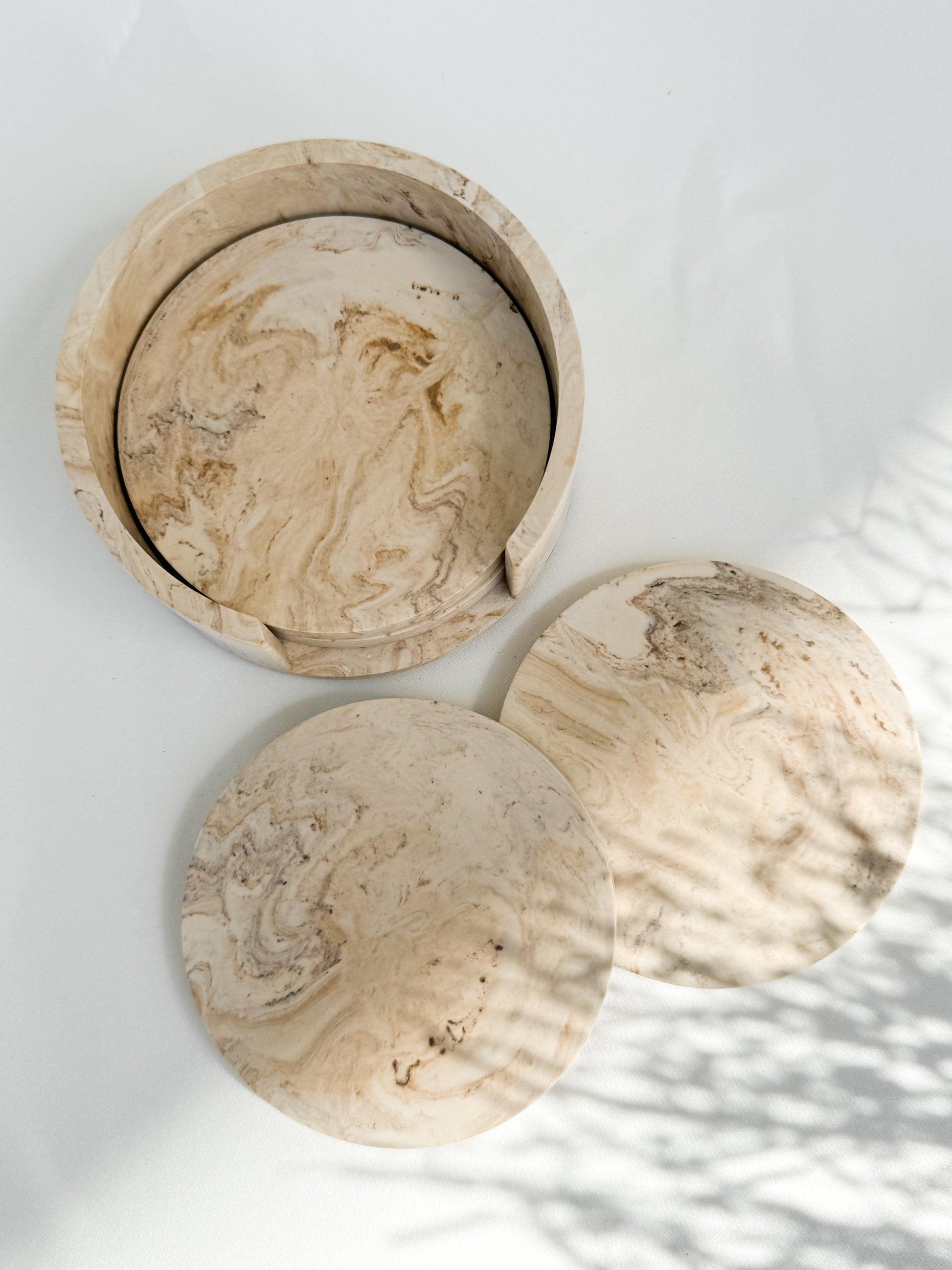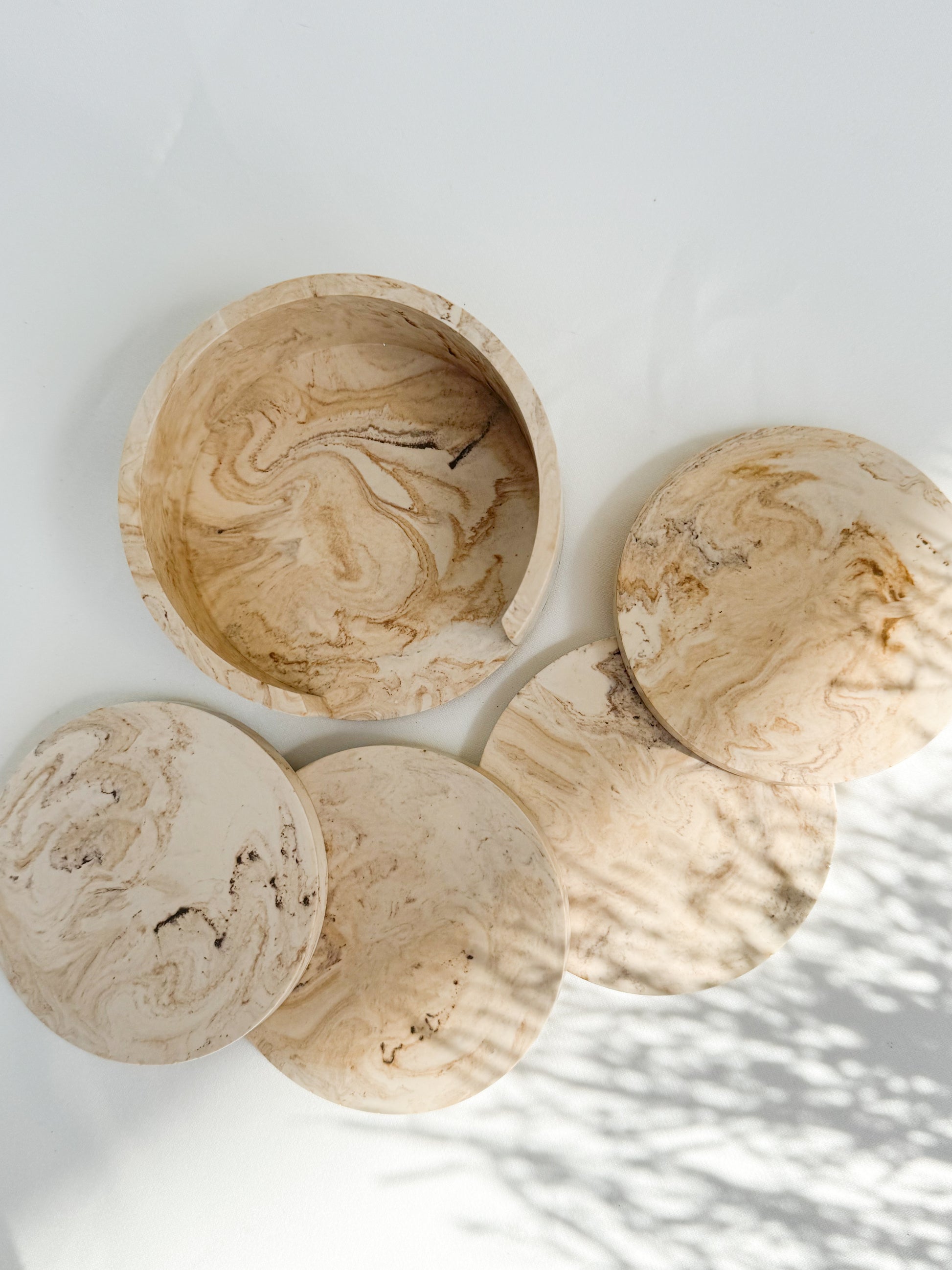 Χειροποίητα σουβερ με τη θήκη τους φτιαγμένα από οικολογική ρητίνη .