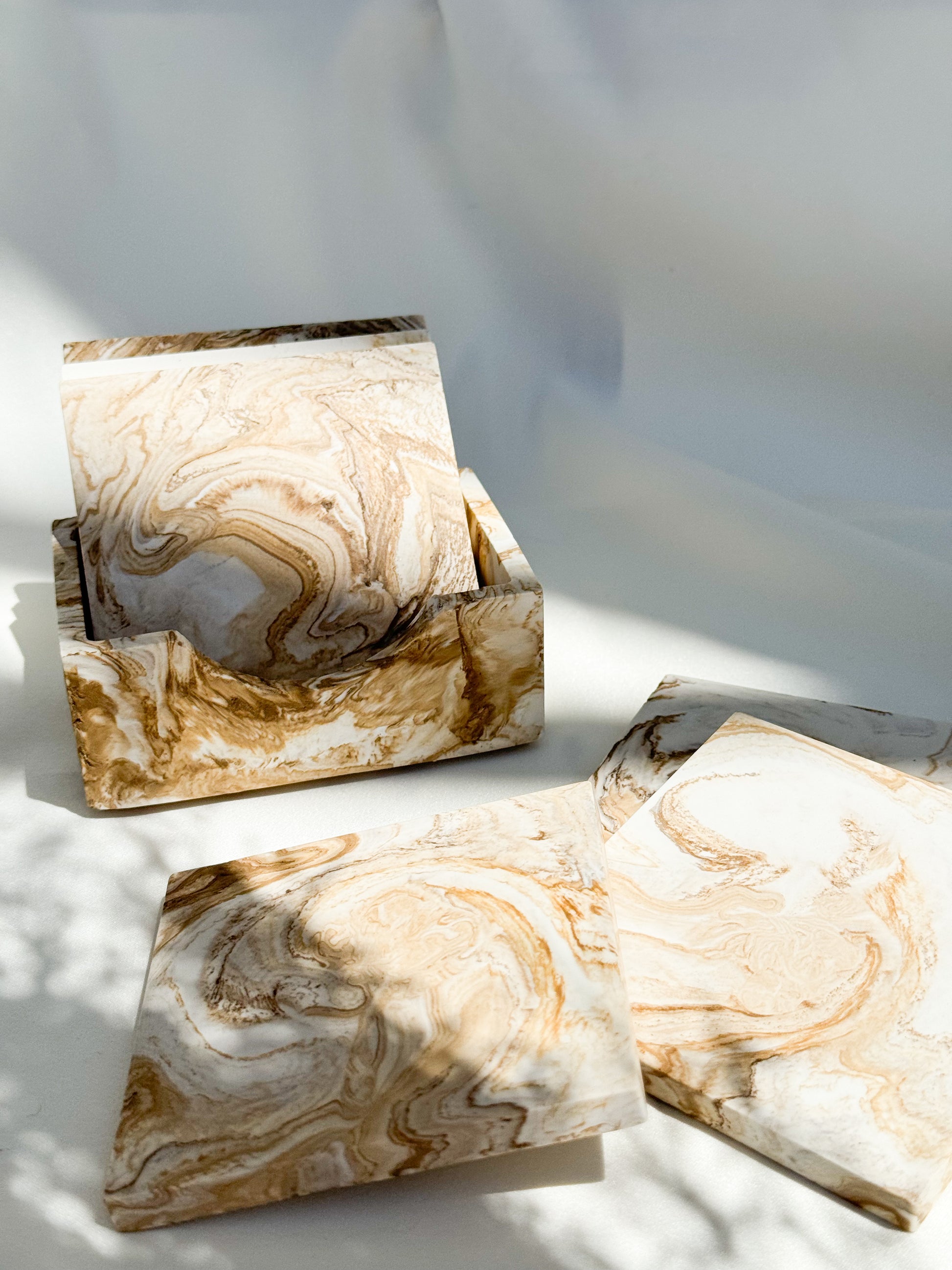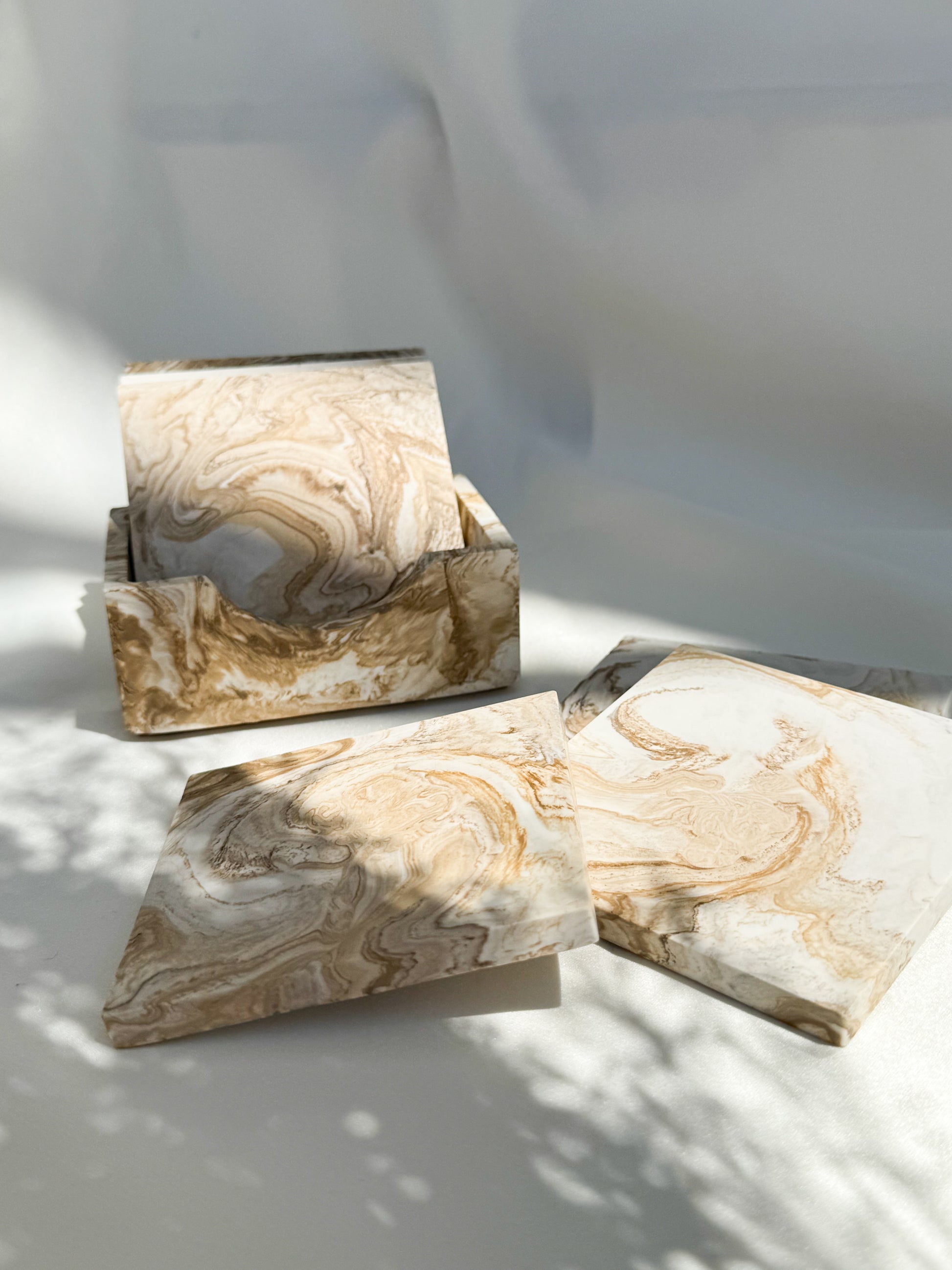Χειροποίητα σουβερ με τη θήκη τους φτιαγμένα από το υλικό Jesmonite .