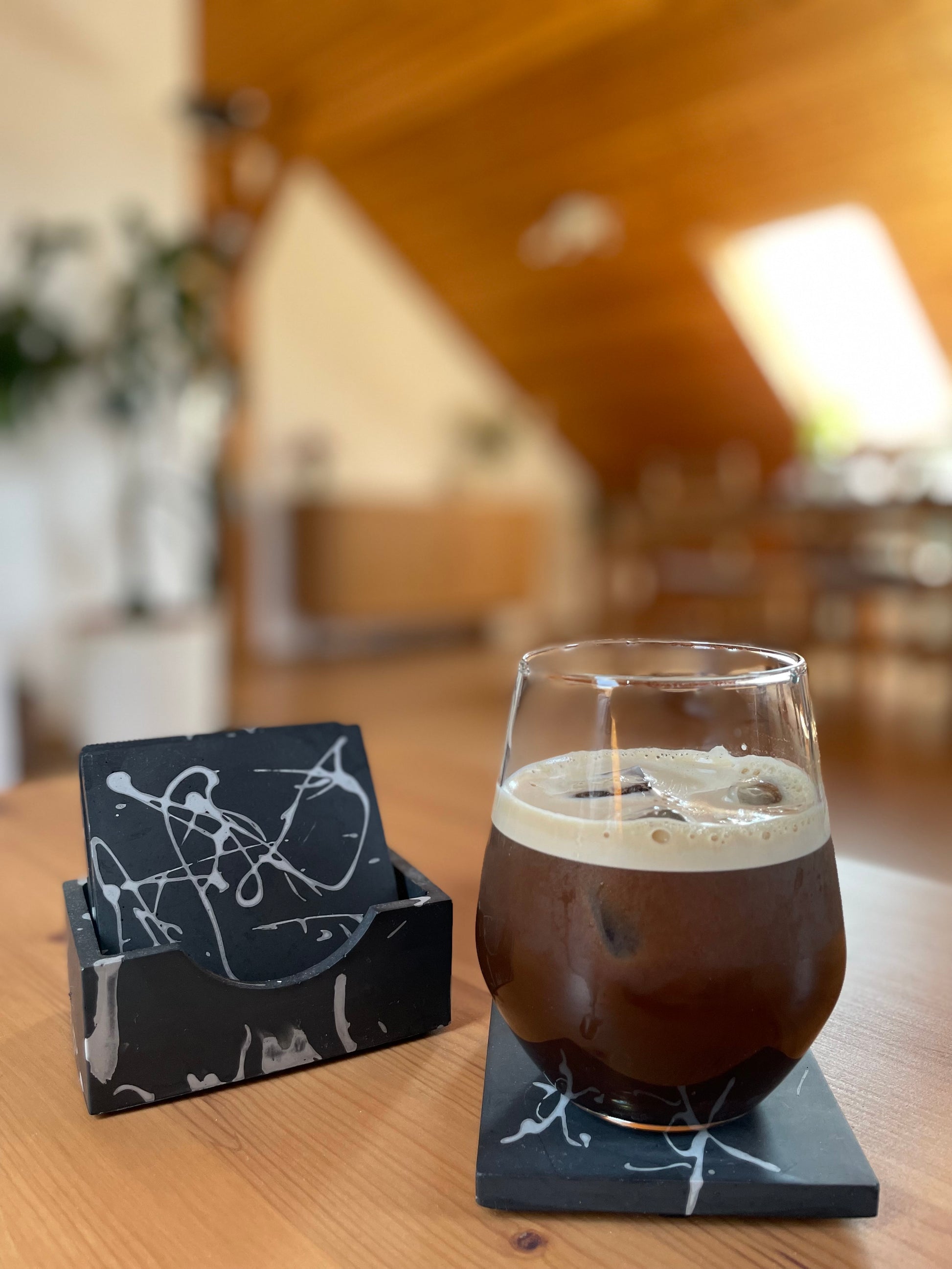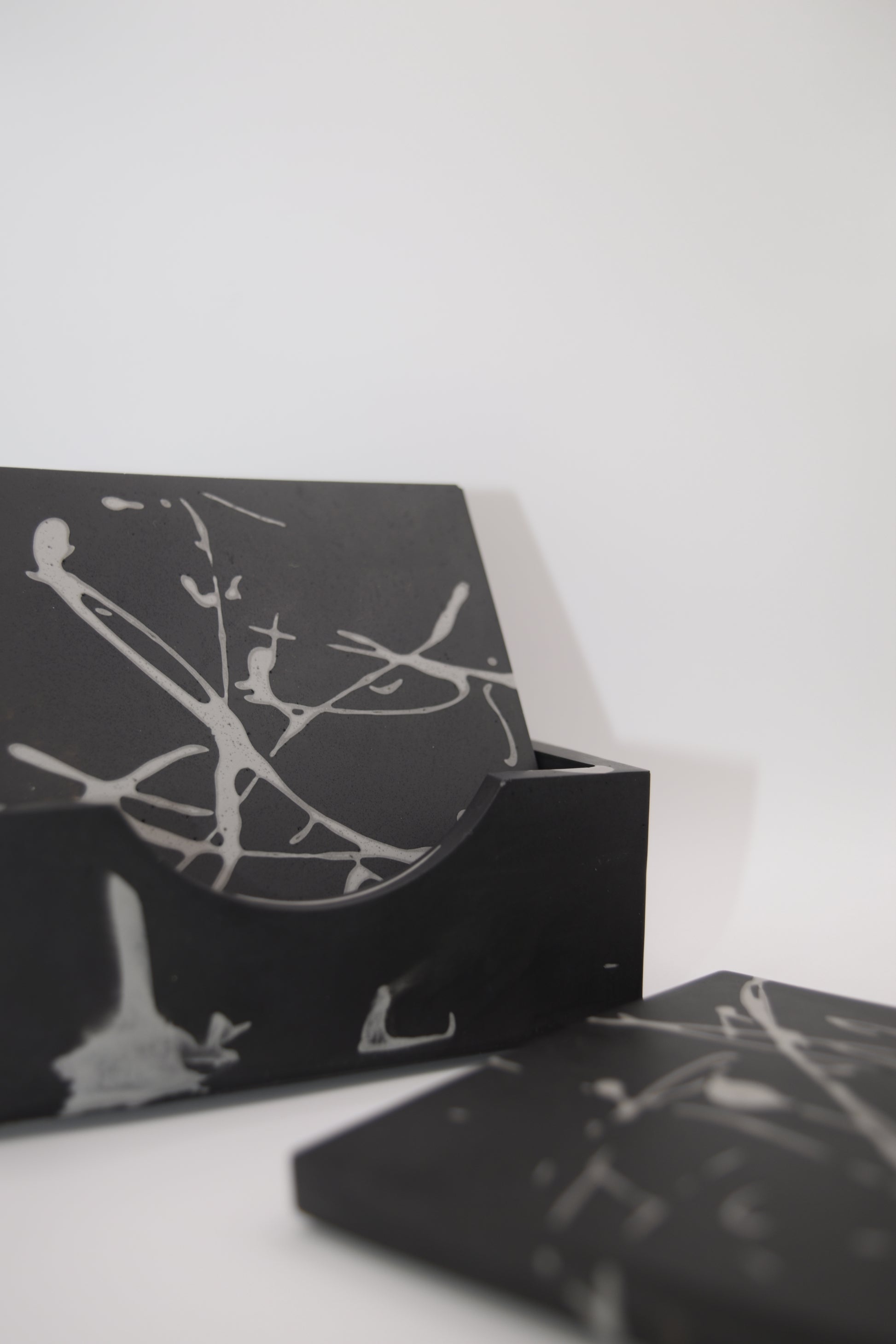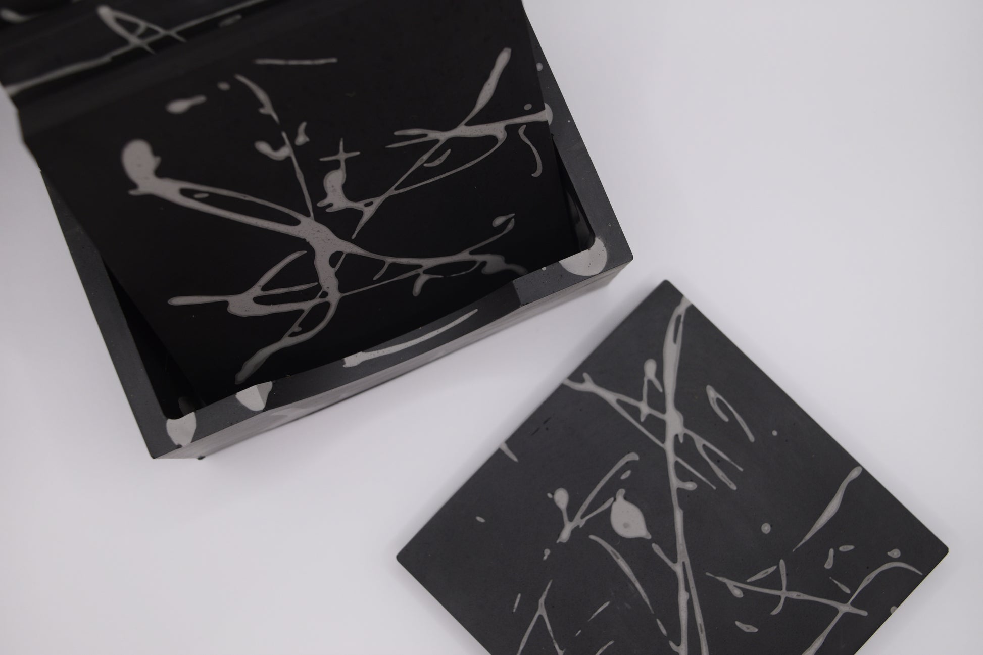 Χειροποίητα σουβερ με τη θήκη τους φτιαγμένα από το υλικό Jesmonite .